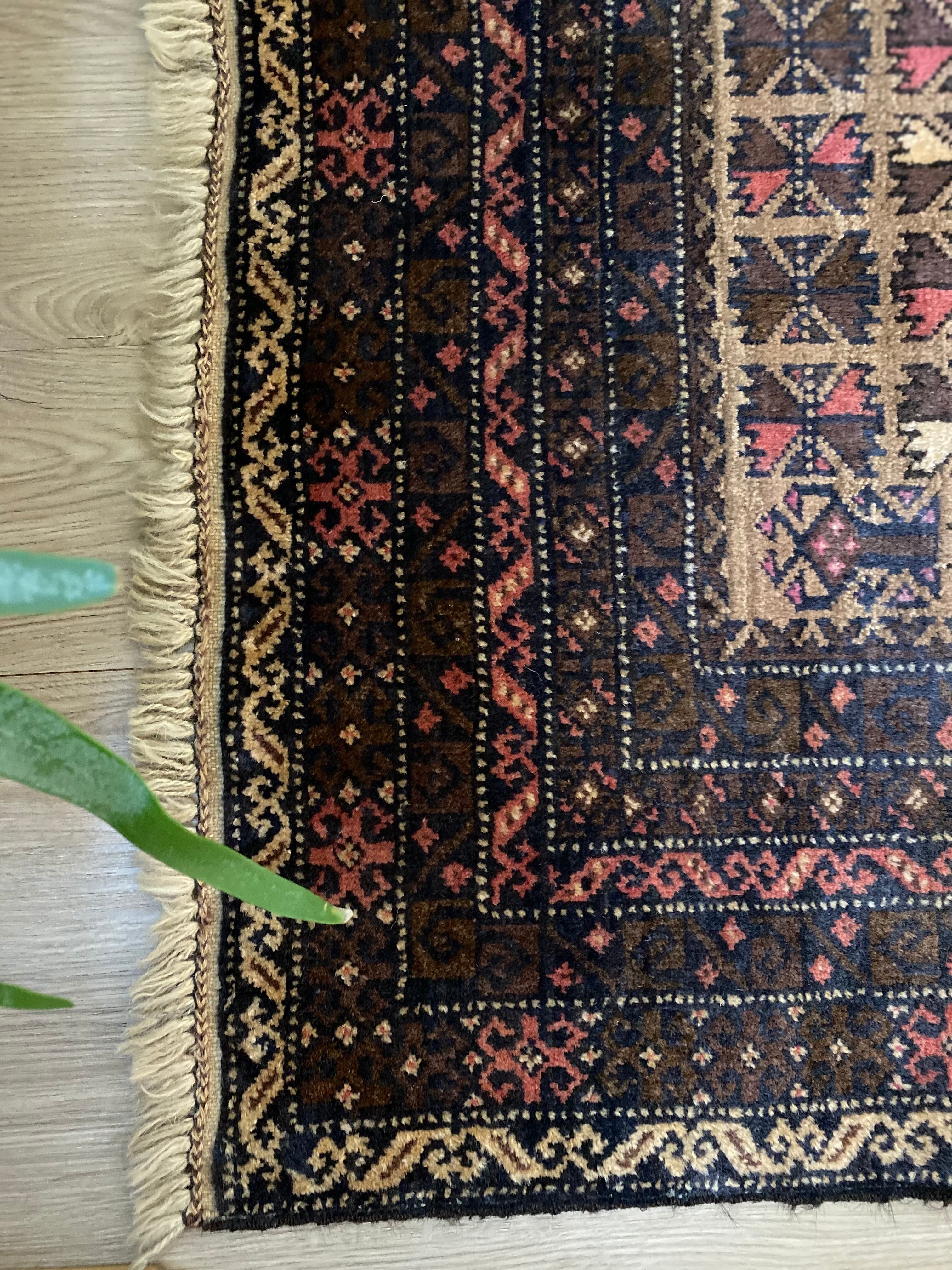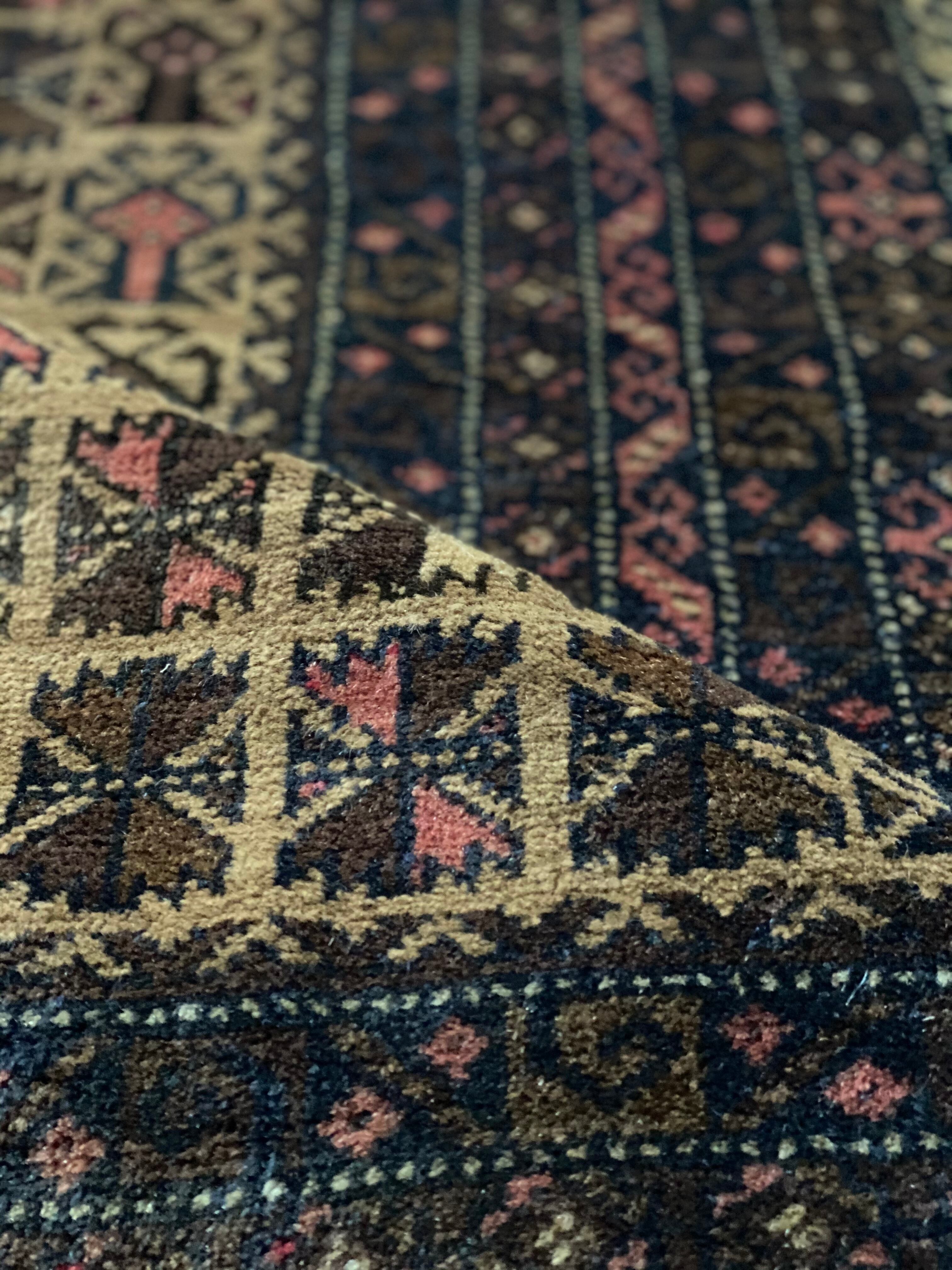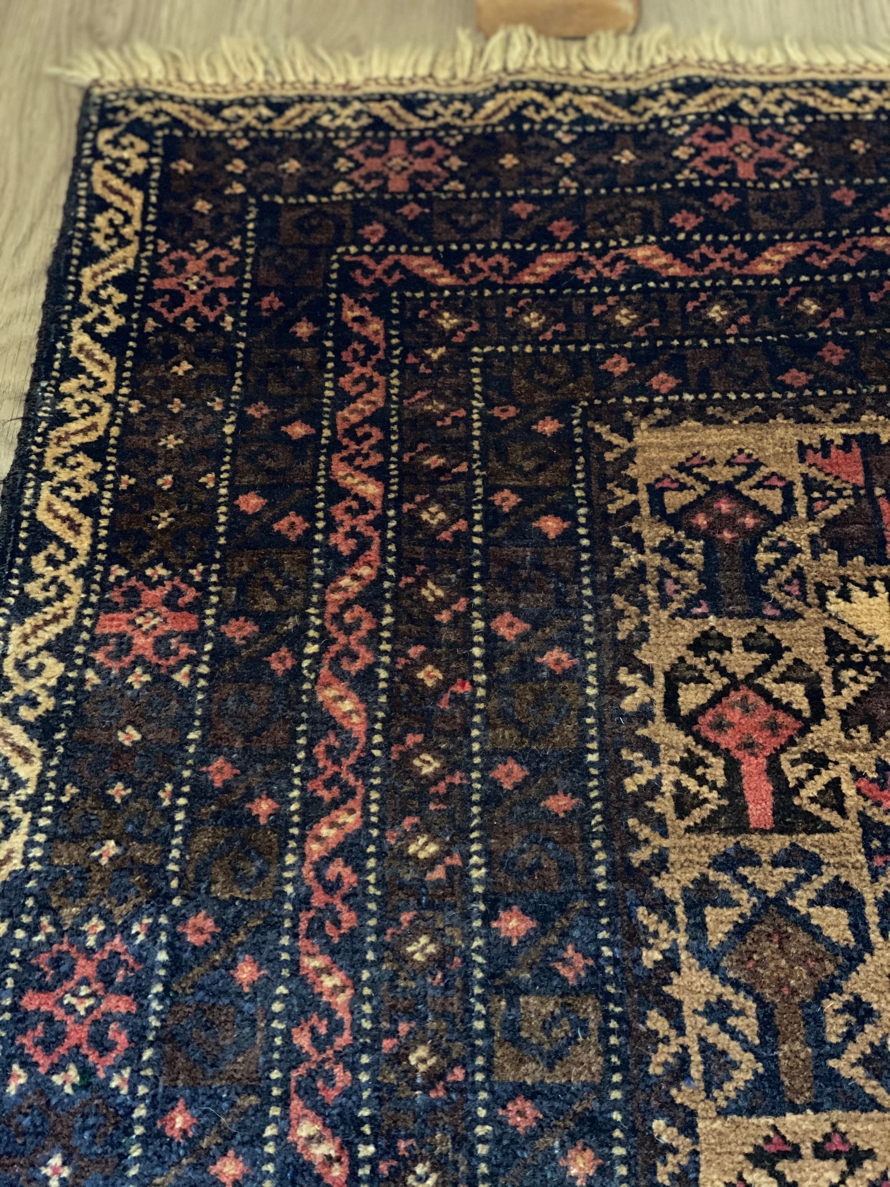 中央にはバルーチ族が好んで表現するトゲのある葉と壺のようなモチーフが織られています。