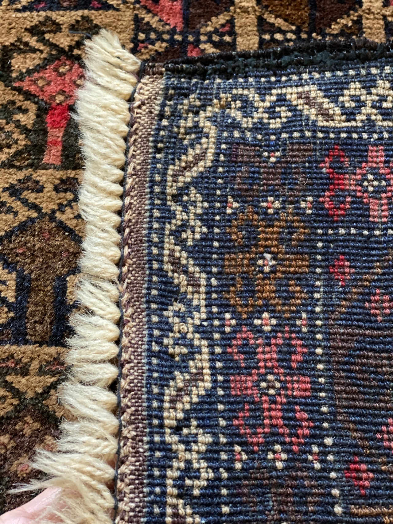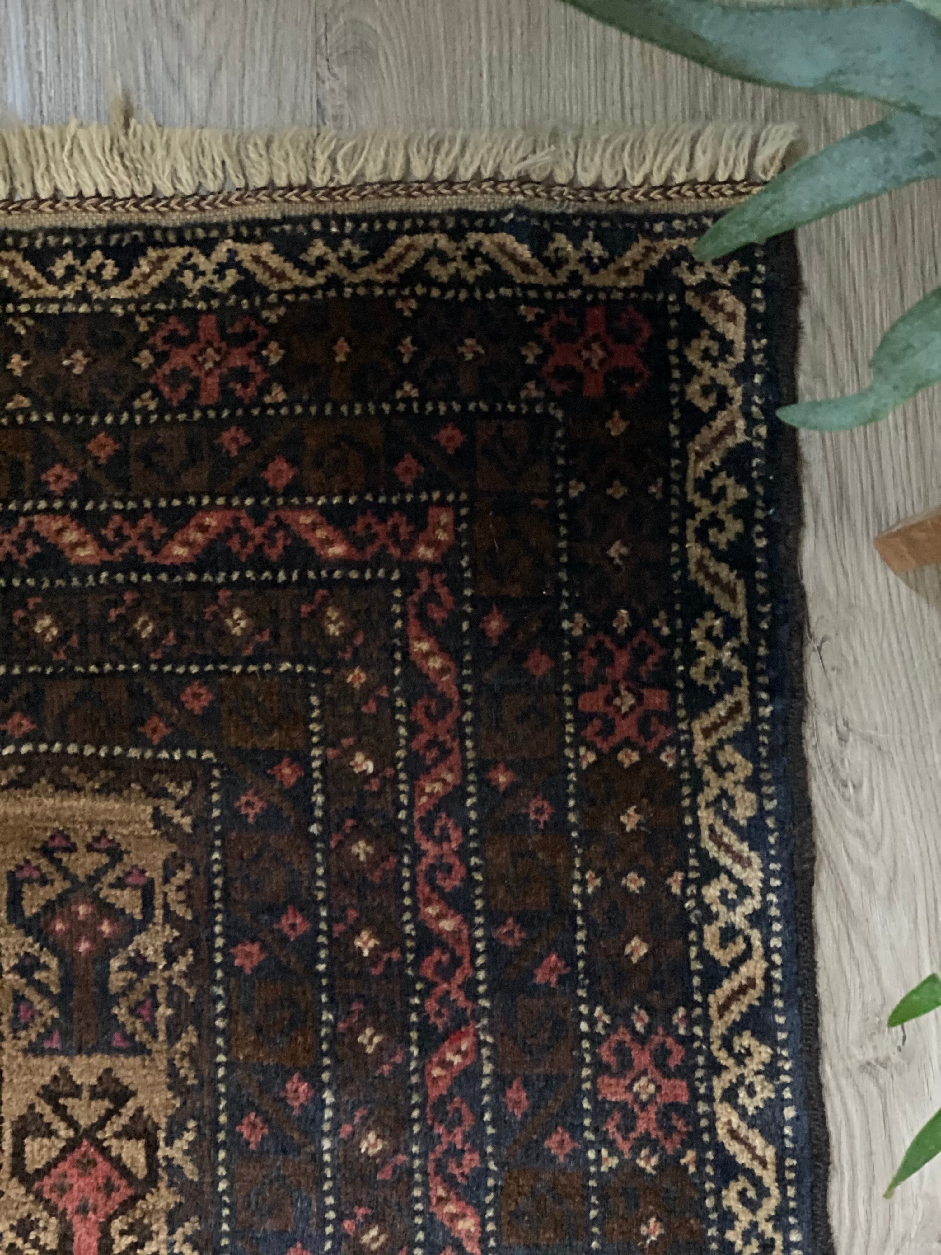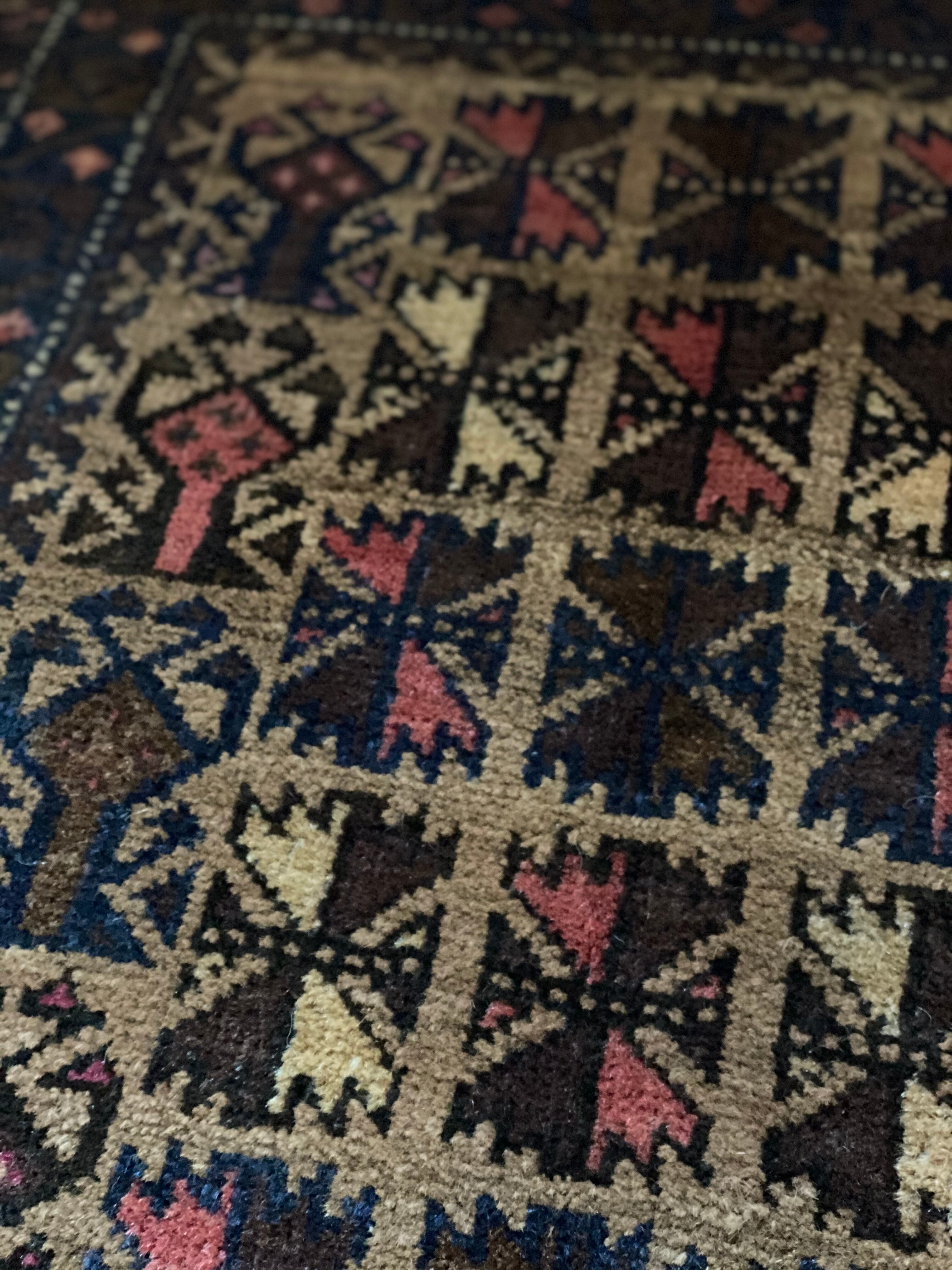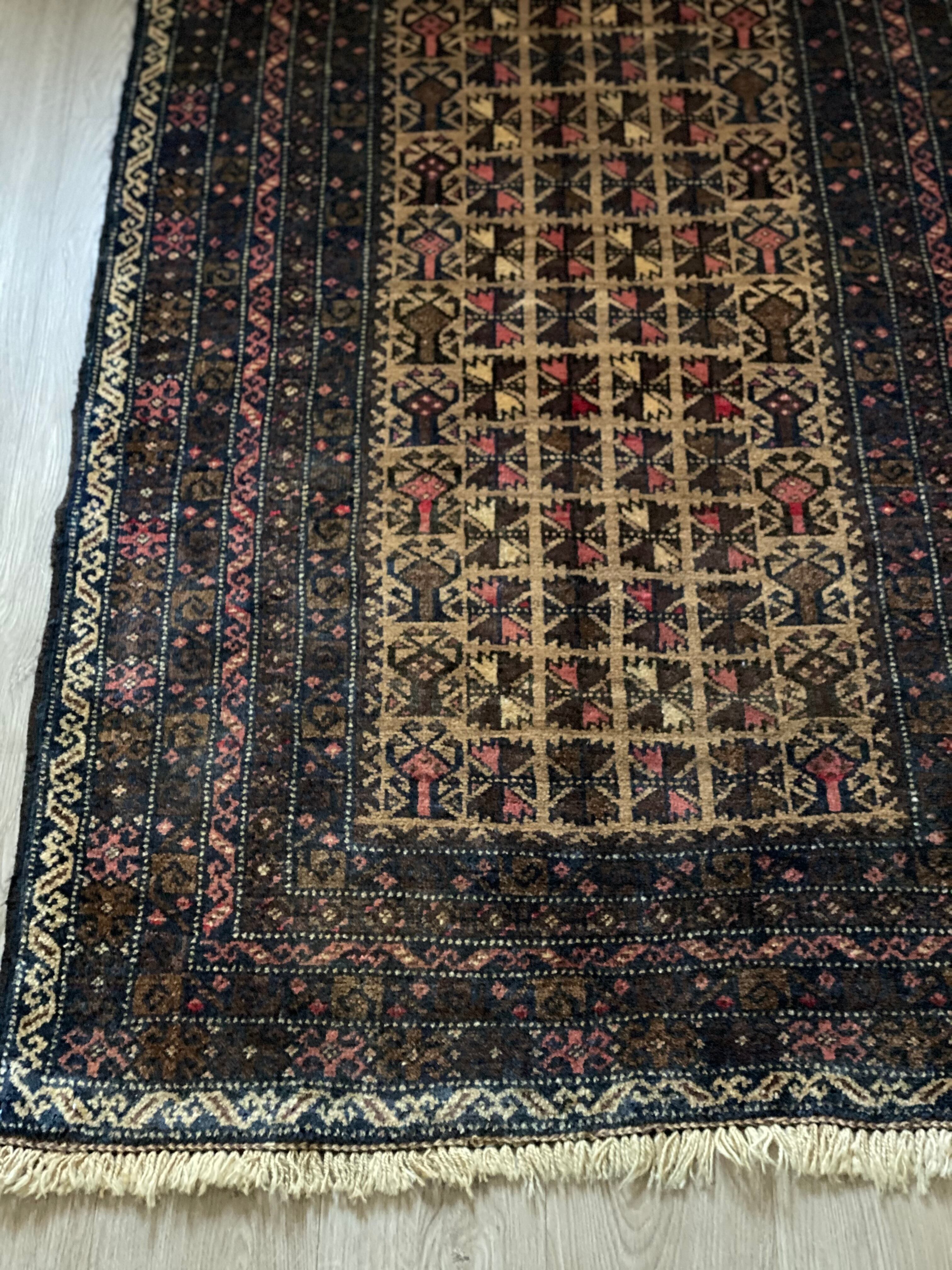中央にはバルーチ族が好んで表現するトゲのある葉と壺のようなモチーフが織られています。