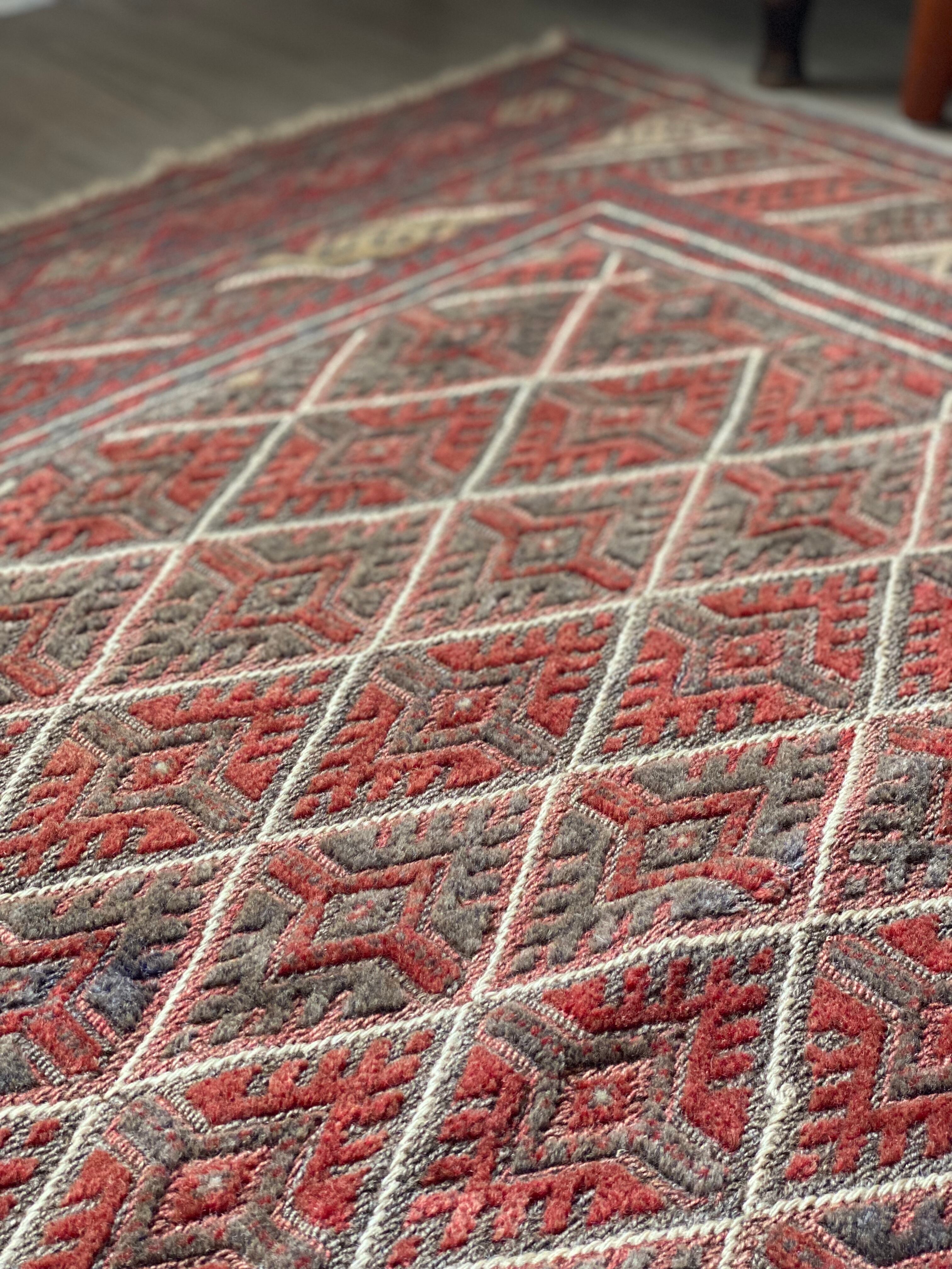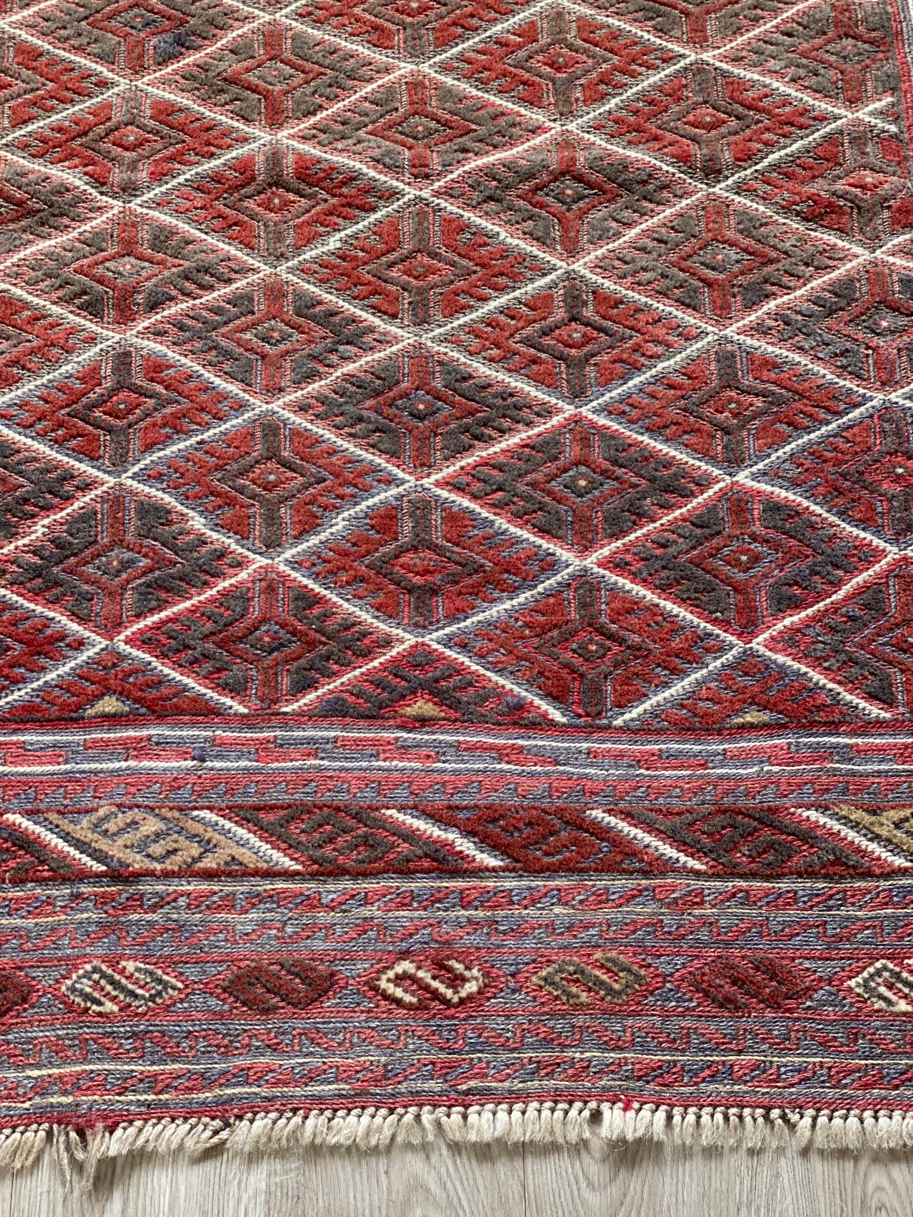 キリムと、パイルのある絨毯織りとを巧みに組み合わせ、素敵なモチーフを描いています。